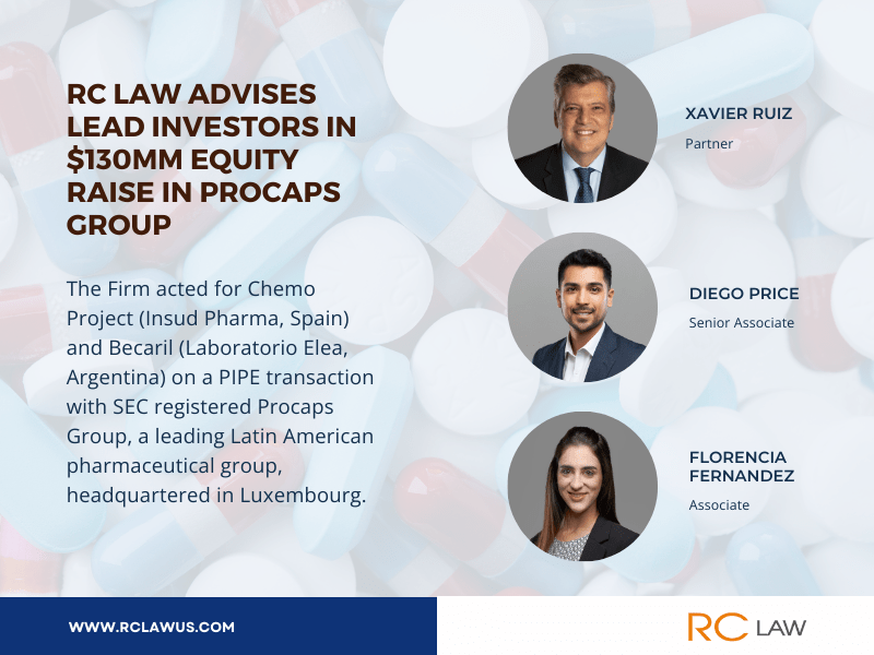 RC Law acted as US counsel to Chemo Project (Insud Pharma) and Becaril (Laboratorio Elea), as anchor investors, in the private placement of an aggregate amount of $130 million in SEC registered Procaps Group, S.A., a leading Latin America integrated pharmaceutical and healthcare company, headquartered in Luxembourg. The transaction also involved the restructuring of the company’s debt with its key financial lenders.